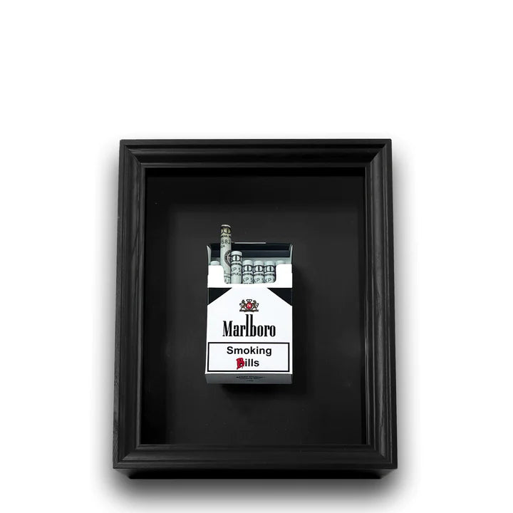 Disfruta de la belleza y el estilo moderno de este cuadro de color negro, con billetes dentro de un cartón de cigarrillos.
